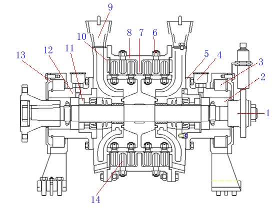 7.轉(zhuǎn)子 8.定子 9.水斗 10.側(cè)殼 11.主軸承 12.擺動軸承 13.軸承蓋 14.定子螺栓 |